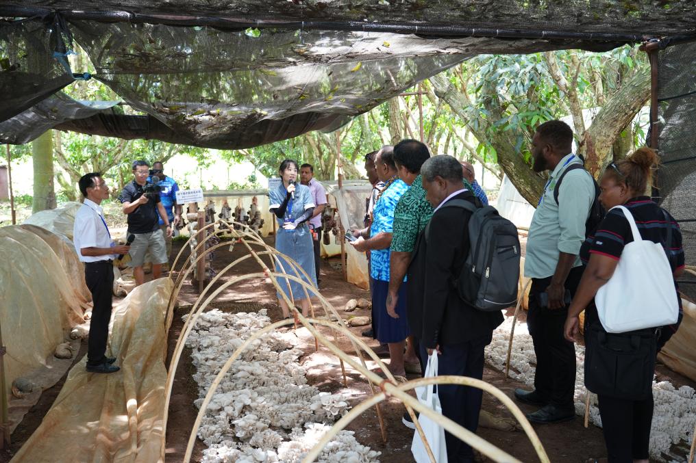 11月19日,在斐济楠迪中国—太平洋岛国菌草技术示范中心,与会代表参观菌草菇种植示范基地。新华社发(高鑫摄)